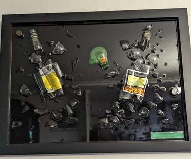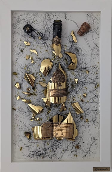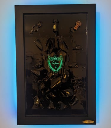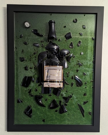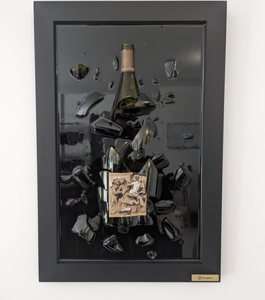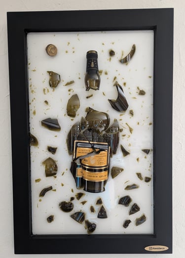 Nous réalisons des tableaux uniques entièrement fabriqués à la main, sur mesure et sur demande. Nos créations intègrent des bouteilles en verre coulées dans une résine qui met en valeur l’esthétique et l’histoire de chaque bouteille. L’objectif est de concevoir une pièce unique, en harmonie avec votre univers, et de conserver un souvenir qui vous est cher.